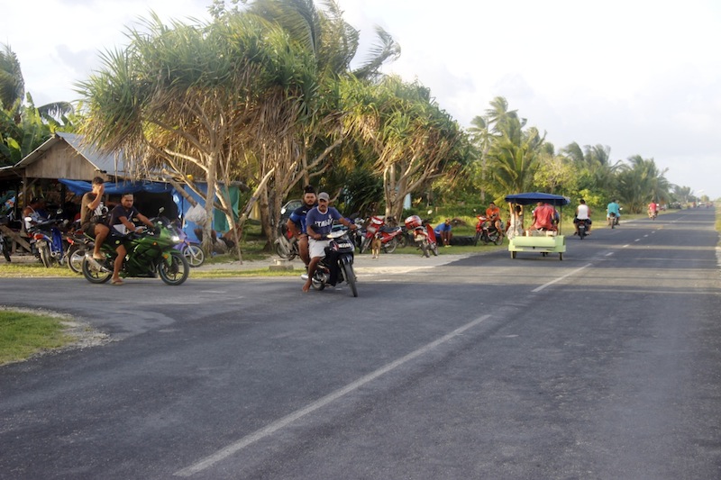 Sorprendentemente observamos también una gran cantidad de motocicletas de todo tipo – hasta unas pocas bellas Harley Davidson. En una densidad de tráfico que se acerca a la de Barcelona. La verdad es que aquí conducen sin casco y descalzos, con bebés en sus brazos, con los hijos mayores en frente o en un remolque. Pero todos se mueven como si fueran las seis de la tarde en la metrópolis catalana. No es que las distancias sean grandes – la carretera no mide mas de 12 km a lo largo del estrecho arrecife. Ni una montaña, ni una colina modesta (que, por otras razones sería altamente deseable). A menudo corren la pista de aterrizaje del Funafuti International Airport arriba y abajo, el espacio público verdadero del pueblo. Que con su urbanidad no tiene nada que envidiar al Fórum de Barcelona. Aquí se hace deporte, la gente se encuentra, se festeja, se pasea, se deja ver. Los dos, tres aviones por semana casi son anecdóticos.